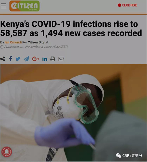 當(dāng)?shù)貢r間11月4日,肯尼亞衛(wèi)生部發(fā)布最新疫情通報稱,在過去24小時內(nèi)檢測了8839份樣本,新增1494例新冠肺炎確診病例,刷新單日新增紀(jì)錄,同時新增12例死亡和586例康復(fù),其中413人通過居家隔離護(hù)理自愈。截至目前肯尼亞累計檢測717172份樣本,累計確診58587例,死亡1051例,康復(fù)38381例,現(xiàn)存病例為19155例。