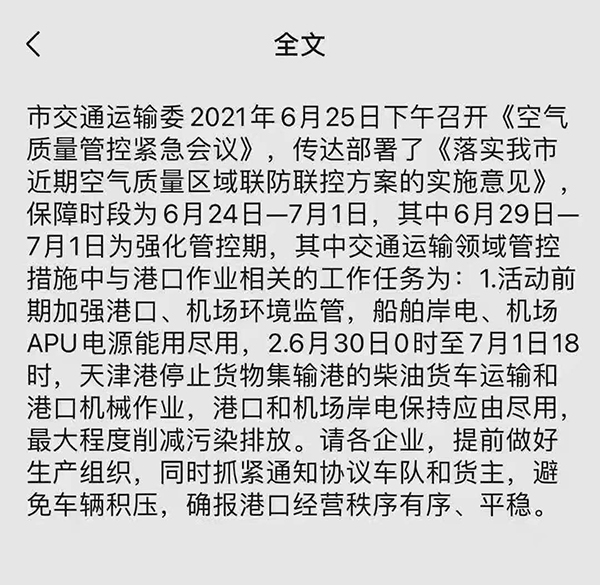Ø 6月30日0時至7月1日18時,天津港停止貨物集輸港的柴油貨車運輸和港口機械作業(yè),港口和機場岸電保持應由盡用,最大程度削減污染排放。