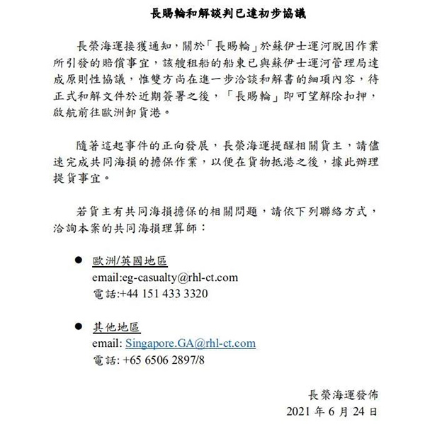 對(duì)于船舶放行后的貨物接卸事宜,長(zhǎng)榮海運(yùn)曾于6月24日發(fā)布公告,提醒相關(guān)貨主,盡快完成共同海損的擔(dān)保作業(yè),以便在貨物抵港后,據(jù)此辦理提貨事宜。
