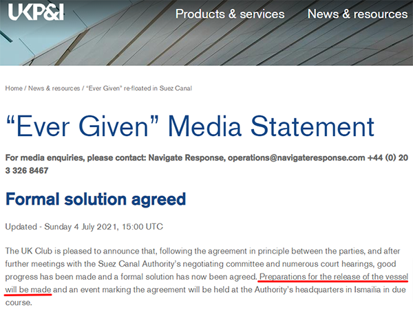 當(dāng)?shù)貢r(shí)間7月4日,負(fù)責(zé)“長(zhǎng)賜”號(hào)貨輪保賠保險(xiǎn)的英國(guó)保賠協(xié)會(huì)發(fā)表聲明稱,關(guān)于今年3月“長(zhǎng)賜”號(hào)貨輪在蘇伊士運(yùn)河擱淺事故賠償糾紛問(wèn)題,船東和保賠協(xié)會(huì)已與埃及蘇伊士運(yùn)河管理局達(dá)成正式解決方案,運(yùn)河管理局將準(zhǔn)備放行貨輪。