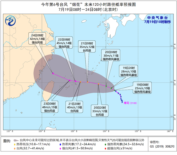 預(yù)計(jì),“煙花”將以每小時(shí)5~10公里的速度向西偏北方向移動,強(qiáng)度逐漸加強(qiáng),最強(qiáng)可達(dá)臺風(fēng)級或強(qiáng)臺風(fēng)級(40~48米/秒,13~15級);21日移入東海海面,然后逐漸向閩浙沿??拷?。