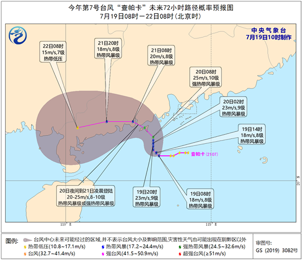 預(yù)計(jì),“查帕卡”的中心將回旋或緩慢移動,強(qiáng)度逐漸加強(qiáng),并于20日夜間到21日凌晨在廣東深圳到茂名一帶沿海登陸(熱帶風(fēng)暴級或強(qiáng)熱帶風(fēng)暴級,8-10級,20-25米/秒);也有可能在廣東中西部近海海面徘徊少動,而后向東北方向移動。