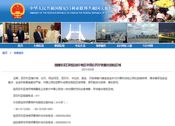當(dāng)?shù)貢r(shí)間8月6日,中國(guó)駐尼日利亞大使館發(fā)出提醒,要求在尼部分區(qū)域的中國(guó)公民加強(qiáng)安全防范,盡快撤出。