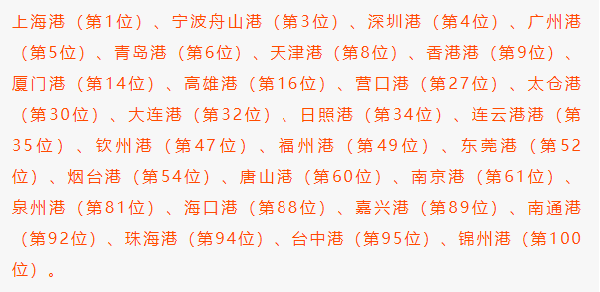 在此次上榜的100大集裝箱港口中,中國港口占27席,分別是: