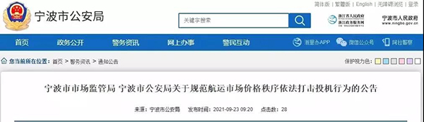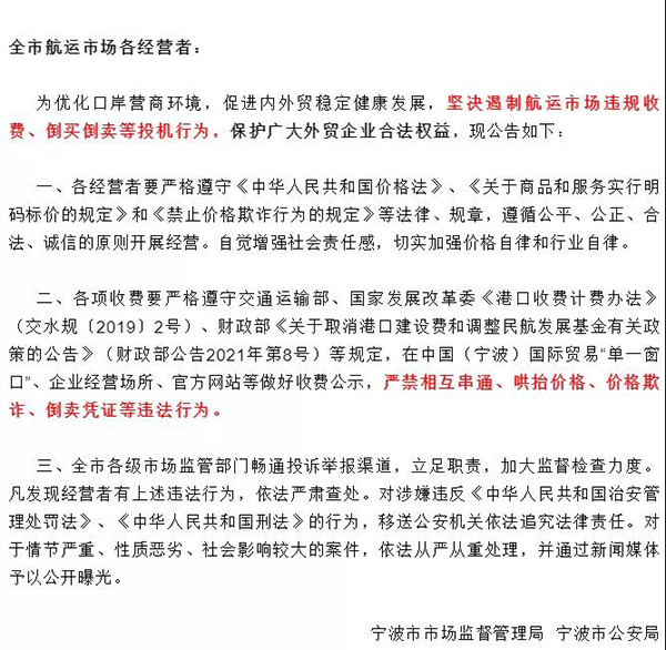 在這份由寧波市公安局和市場(chǎng)管理局發(fā)布的《關(guān)于規(guī)范航運(yùn)市場(chǎng)價(jià)格秩序依法打擊投機(jī)行為的公告》中,明確指出: