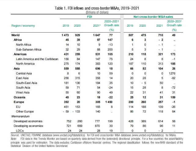 根據(jù)聯(lián)合國(guó)貿(mào)發(fā)會(huì)議發(fā)布數(shù)據(jù),2021年,全球外國(guó)直接投資(FDI)流量出現(xiàn)強(qiáng)勁反彈,從2020年的9290億美元增長(zhǎng)到1.65萬億美元,同比增長(zhǎng)77%,超過了新冠疫情爆發(fā)前(2019年的1.47萬億美元)的水平。