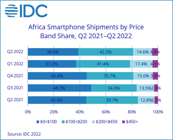 如果從價(jià)格來看,在第二季度,非洲智能手機(jī)的平均銷售價(jià)格則下降了3%左右。其中,價(jià)格在100美元到200美元的手機(jī),最受到消費(fèi)者的喜愛,份額達(dá)到了42.2%。其次則是價(jià)格在100美元以下的手機(jī)產(chǎn)品,選擇這個(gè)價(jià)位手機(jī)的消費(fèi)者有38.8%。此外,選擇價(jià)格在200美元到450美元手機(jī)的消費(fèi)者有14.6%,450美元以上的則有4.4%。