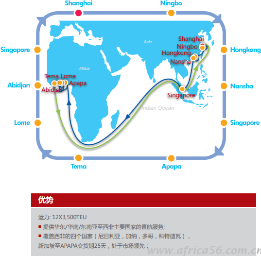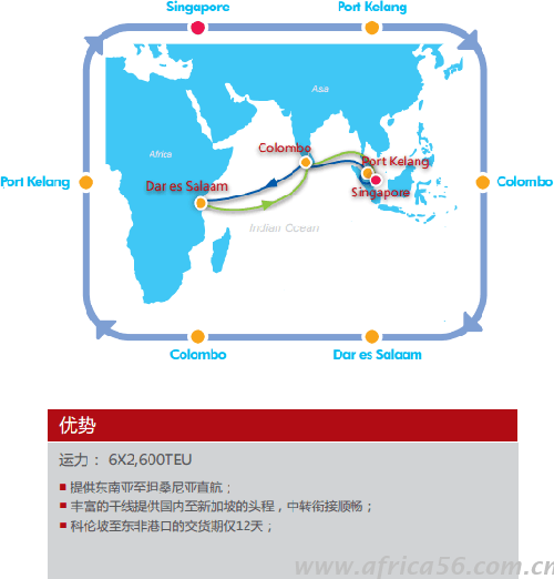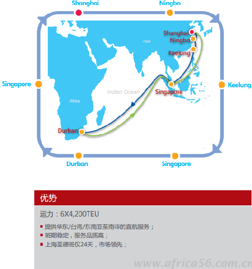 自2016年6月15日起將全面整合中海集運所有航線,從此將由中遠集運來營運非洲航線,新非洲航線路徑如下:
